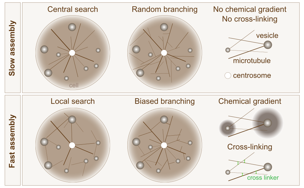 The remarkable property of microtubules is a stochastic alternation between their growth and shrinkage, termed dynamic instability, which has been shown to be vital in their role in capturing and arranging cellular organelles in an orderly configuration, with the most striking examples being the reassembly of the Golgi complex after cell division, rapid aggregation of the pigment granules in fish melanophores, and congression of the chromosomes in the mitotic spindle. How this mechanism of search and capture, which was proposed 40 years ago, functions in various cellular contexts is an exciting area of research. Originally, the search-and-capture model described only microtubules as growing in a random direction, followed by their rapid shrinking and then re-growing in a different direction. This basic behavior was later augmented by a plethora of other mechanisms, such as microtubule branching, interactions with molecular motors, cross-linkers, and growth-modulating gradients, as well as microtubule pivoting, all of them aiding a more successful search. MajaNovak_2025